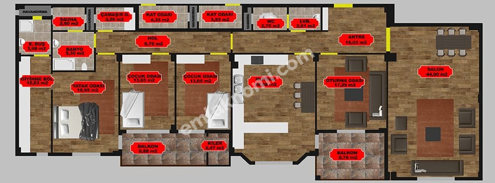 Özel Alanlar: Giyinme Odası, Çamaşır Odası ve daire içindeki Sauna gibi lüks ve hayatı kolaylaştıran özel bölümlerin bulunması, yaşam standardınızı yükseltir.